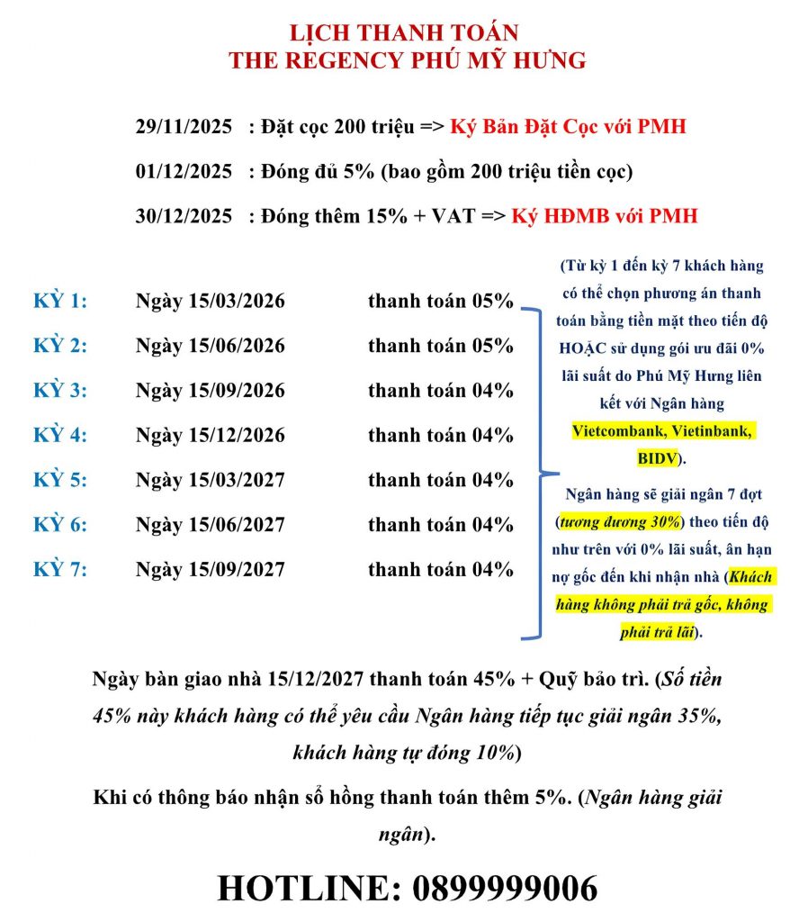 Lịch thanh toán từng đợt dự án The Regency, khách hàng chỉ cần thanh toán trước 20% cho đến khi nhận nhà