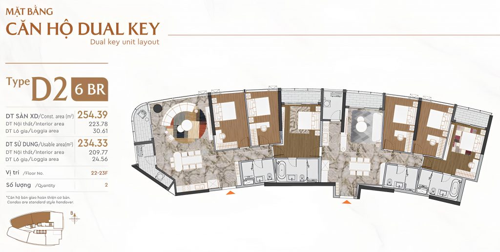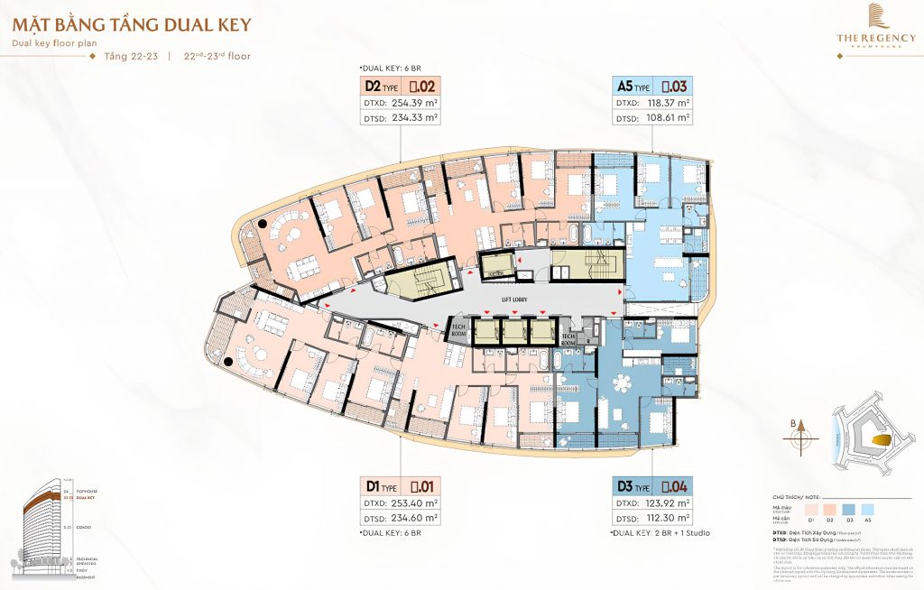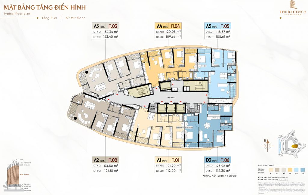 Chỉ với 114 căn hộ (112 căn 3 phòng ngủ, 4 căn dual key 253m², 2 penthouse duplex và 4 shophouse), The Regency là dự án “giới hạn nguồn cung” đích thực. Mật độ xây dựng thấp trên khu đất 22.781m² đảm bảo sự riêng tư và thoáng đãng. The Regency mang đến tính độc quyền cho cộng đồng tinh hoa.