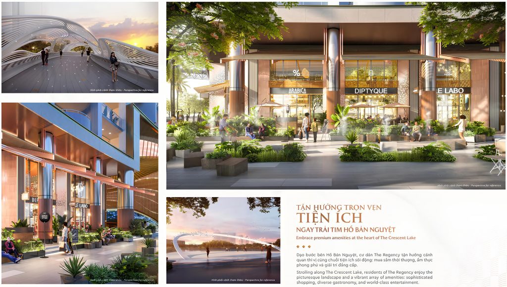 The Regency thừa hưởng hệ sinh thái ngoại khu đẳng cấp: 50m đến Hồ Bán Nguyệt & Cầu Ánh Sao, 700m đến Crescent Mall (thương hiệu xa xỉ, F&B cao cấp), 500m đến SECC và CBD tài chính.